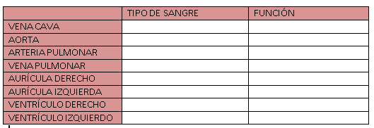 - Completa el esquema del corazón con los nombres de las partes correspondientes. Colorea las partes de acuerdo a la sangre que transporten. Azul para sangre oxigenada y rojo para sangre desoxigenada
