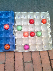 Colocar un cartón de huevos e intentar embocar con un pique intermedio la pelota dentro del cartón a diferentes distancias.